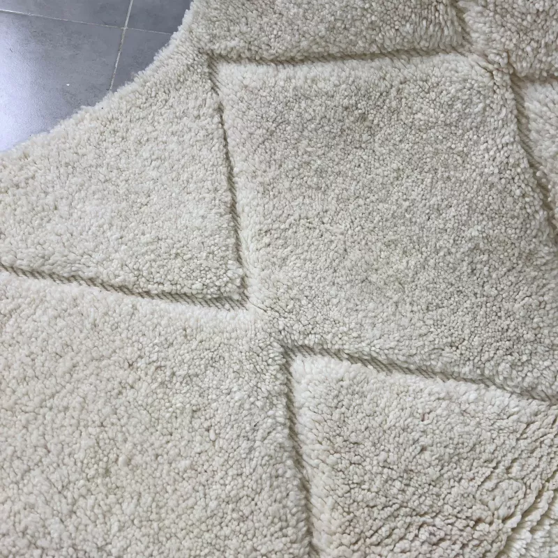 Cette matière noble est triée à la main par les artisanes, qui choisissent uniquement les fibres les plus fines et les plus souples, celles qui donneront au tapis son toucher unique et sa tenue dans le temps.