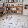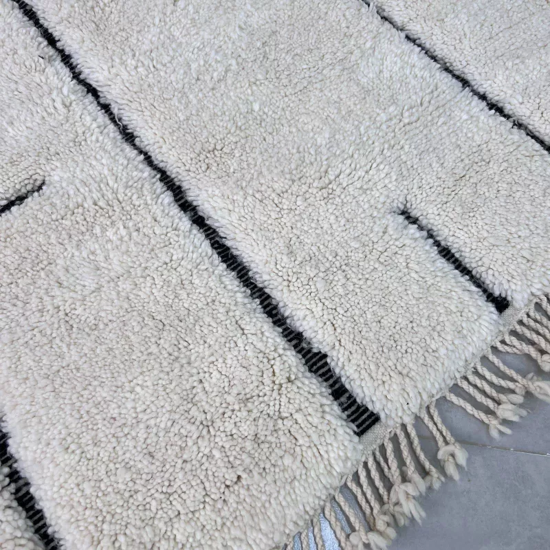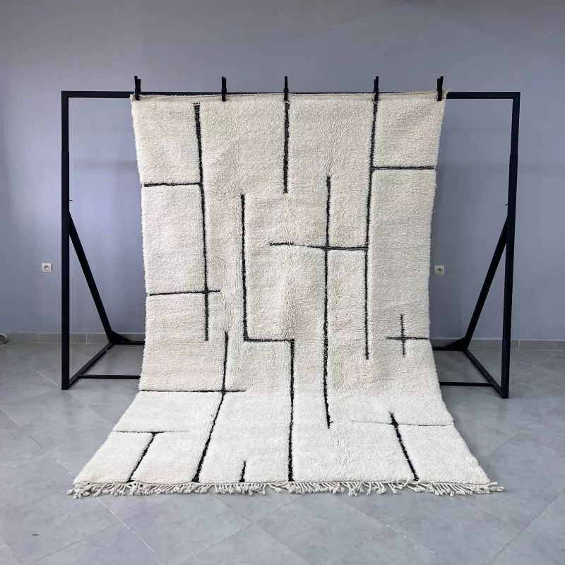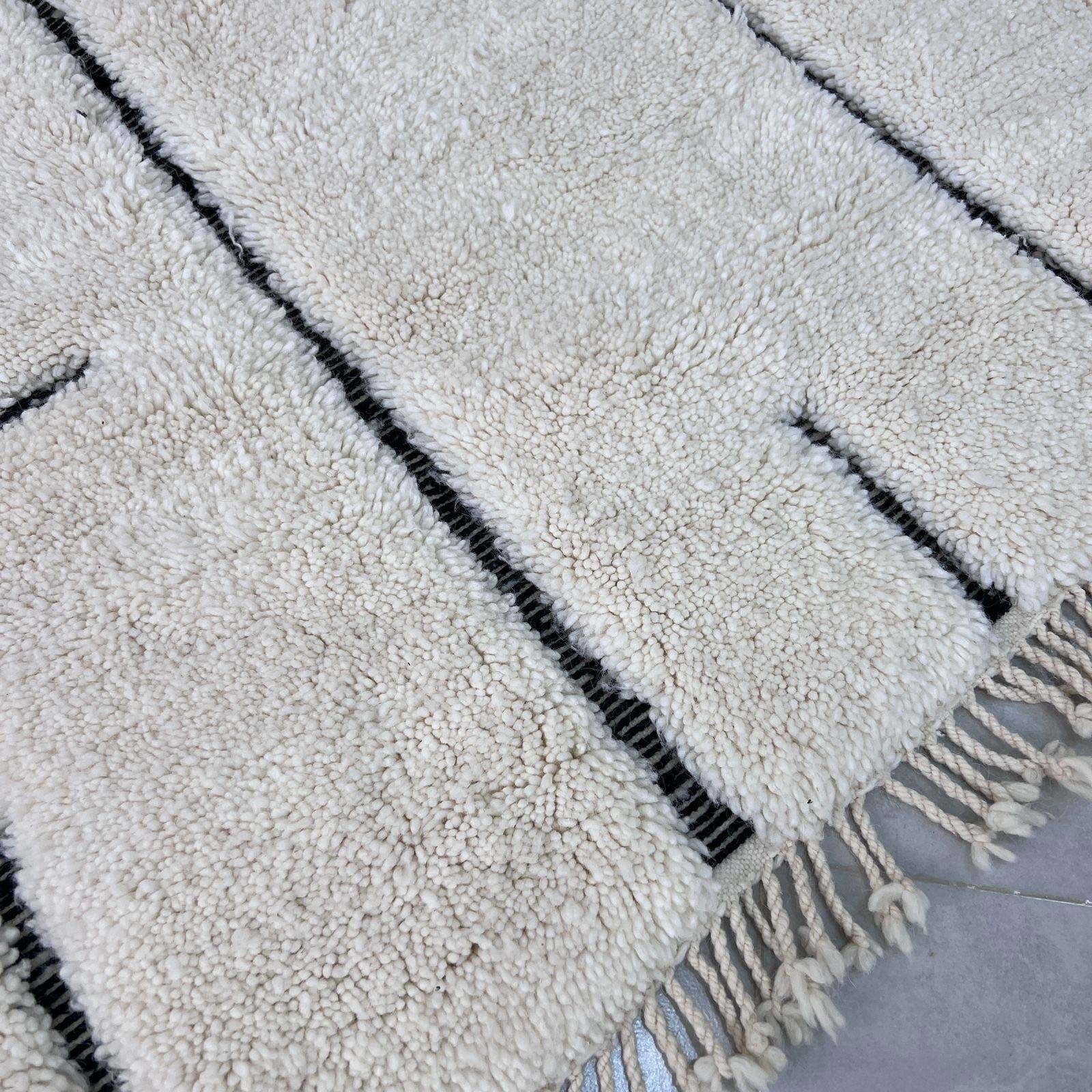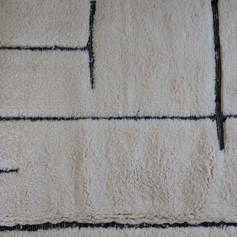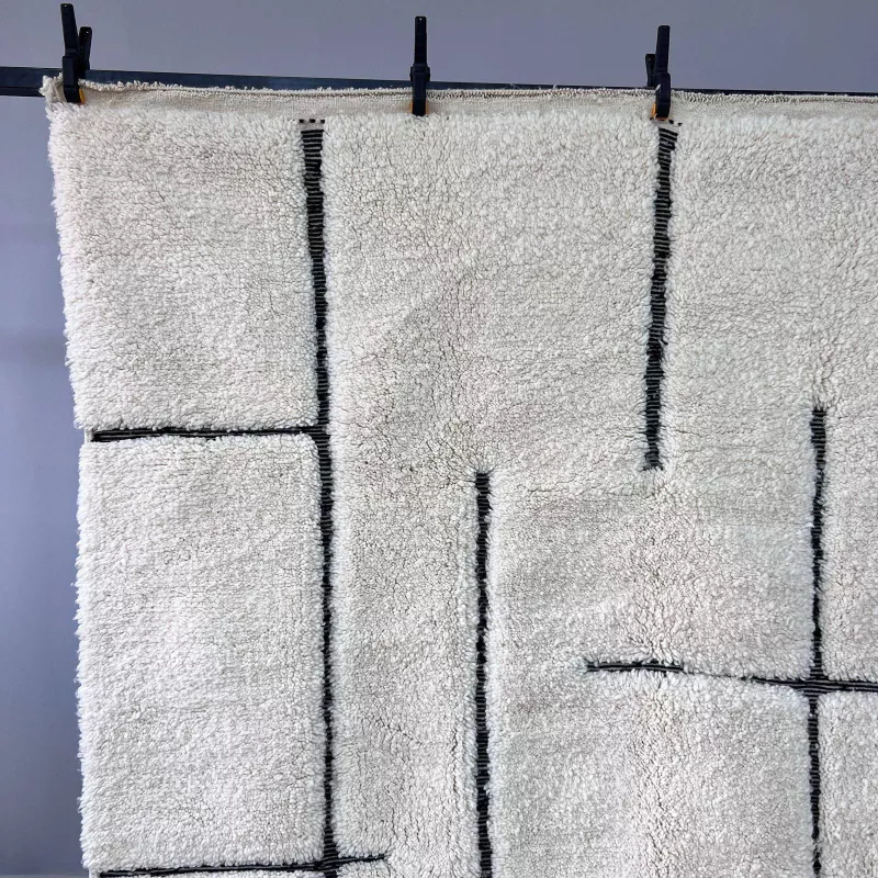 Ce tapis Beni Ouarain en laine naturelle, tissé à la main par des artisanes berbères du Moyen Atlas, revisite les codes du design marocain dans une version moderne et architecturale.