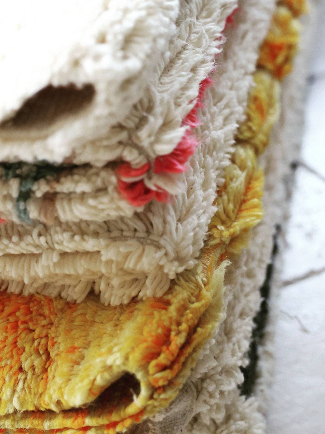 Cette matière noble est triée à la main par les artisanes, qui choisissent uniquement les fibres les plus fines et les plus souples, celles qui donneront au tapis son toucher unique et sa tenue dans le temps.