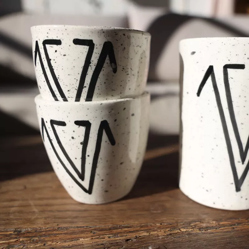 Façonnée artisanalement au Maroc, elle affiche un design contemporain relevé d’un effet moucheté subtil et d’un motif peint à la main. Résultat : une tasse pleine de personnalité, authentique, robuste et terriblement élégante.